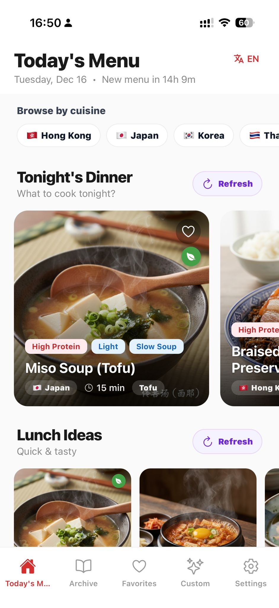Wake up to a fresh menu every day at 7 AM. Never run out of ideas.